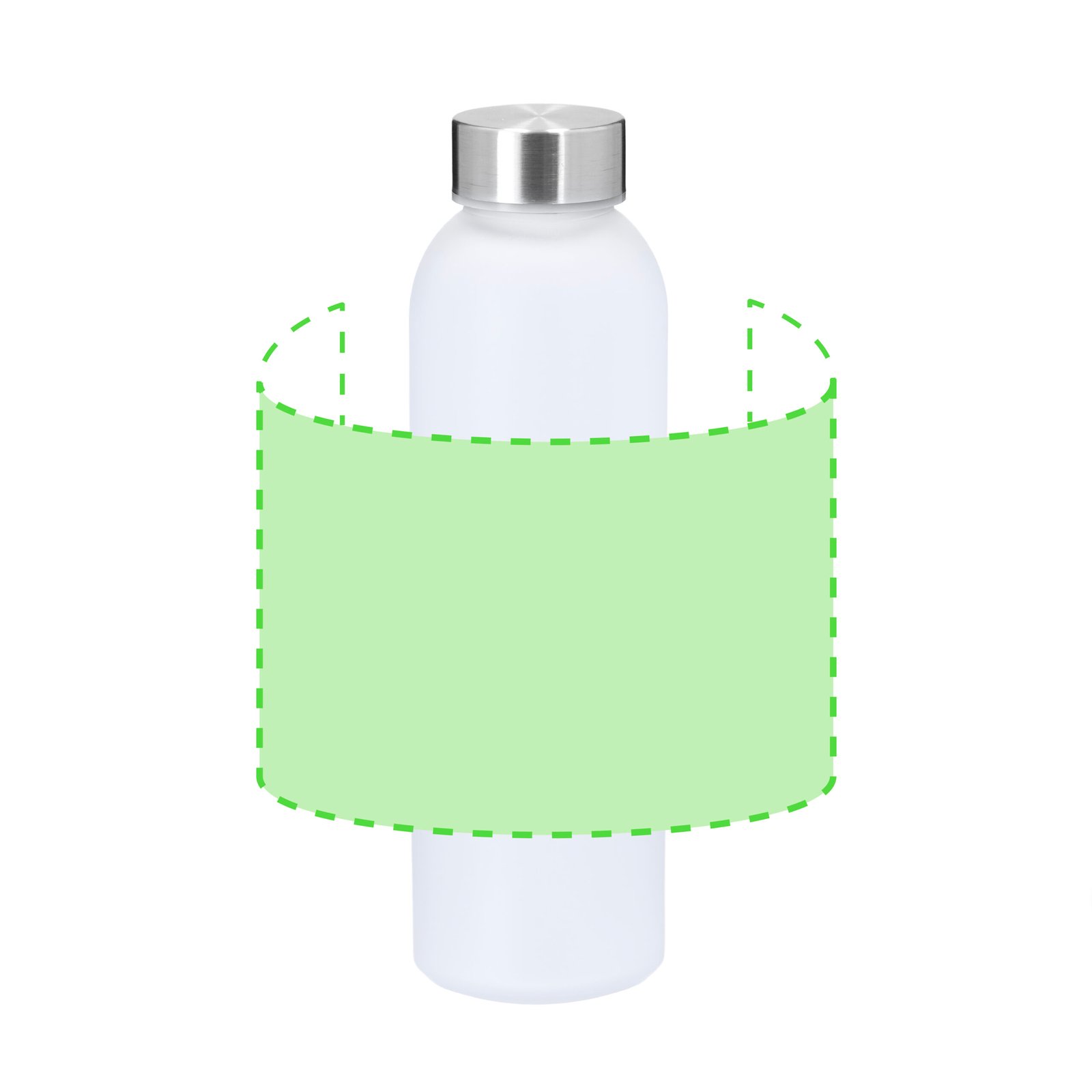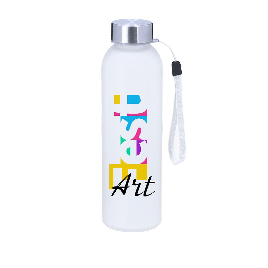 Bidón de 500 ml de capacidad, ideal para marcaje en sublimación. Cuerpo fabricado en cristal acabado frosted y tapón de acero inox libre de BPA. Incluye práctico cordón de para transporte.