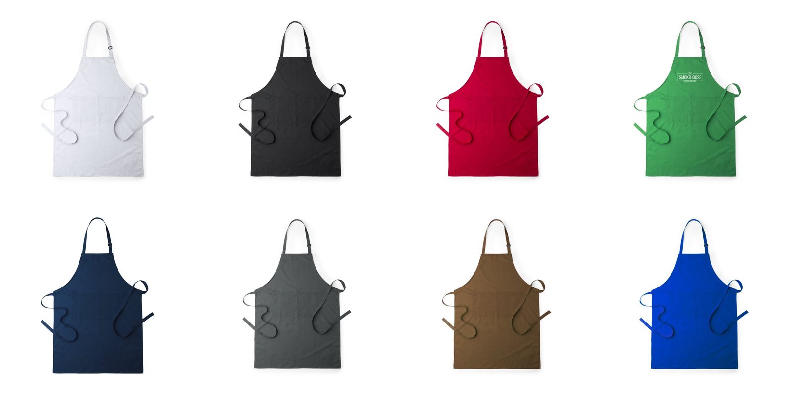 Delantal de alta calidad en material TC -combinado de algodón y poliéster-. En variada gama de vivos colores, con bolsillo doble frontal y cintas de cuello con ajustador. De corte por debajo de la rodilla.