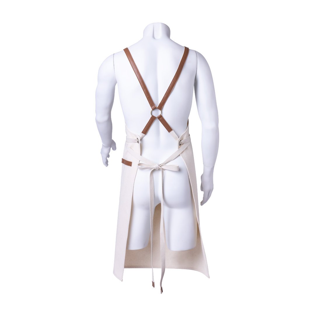 Delantal de alta calidad en resistente algodón canvas de 340g/m2, con costuras reforzadas. De corte por debajo de la rodilla, con cintas en resistente polipiel y triple ajuste: cuello, espalda y cintura. Con bolsillo frontal, accesorio en polipiel y remaches metálicos de refuerzo.
