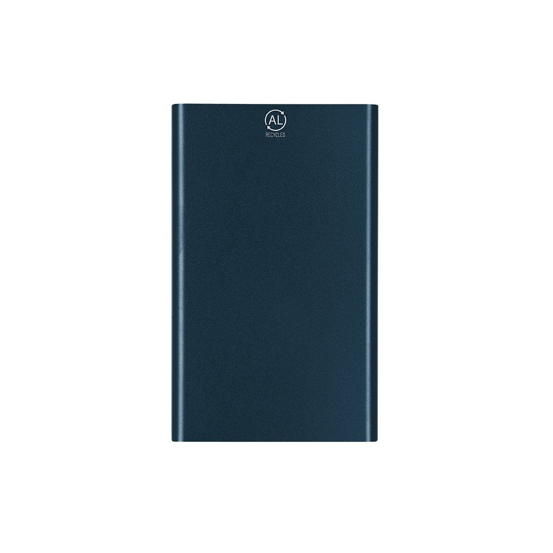 Batería auxiliar externa de 4.000 mAh en Aluminio Reciclado. Con salida USB y entrada/salida USB Tipo C. Indicadores LED de estado de carga y cable de carga Tipo C incluido. Incluye distintivo de Aluminio Reciclado.