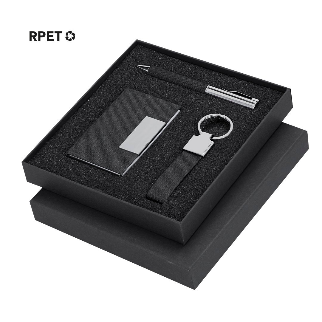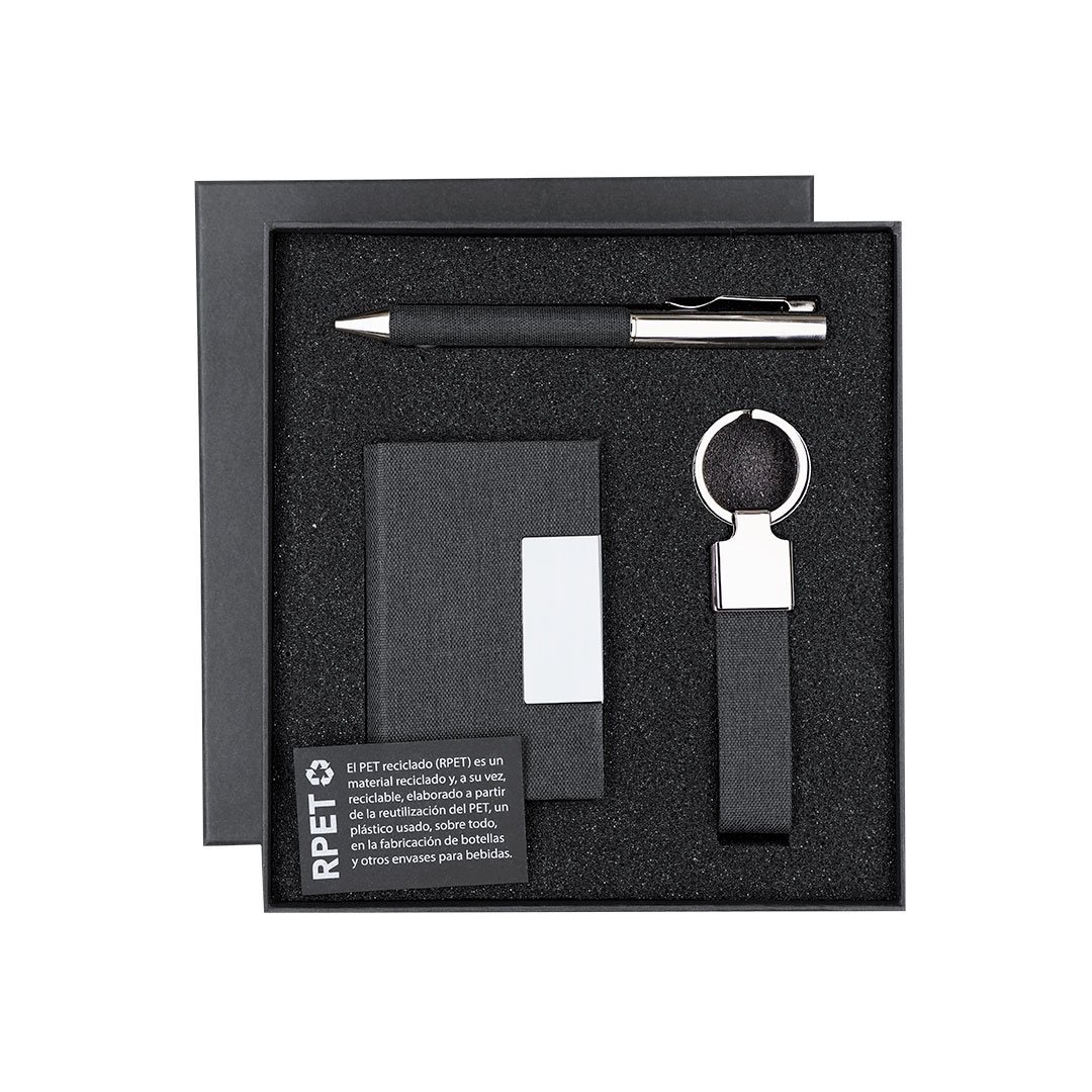 Elegante set en RPET con acabado negro bitono y detalles metálicos. Incluye: