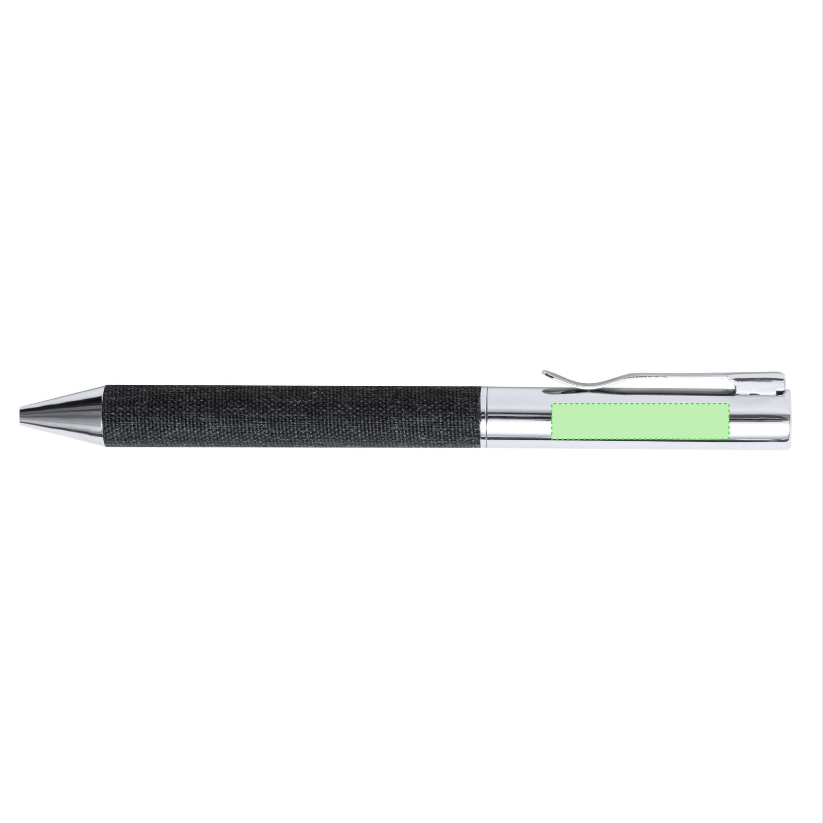 -Bolígrafo de RPET de acabado negro bitono y detalles metálicos. Con mecanismo giratorio y tinta azul.