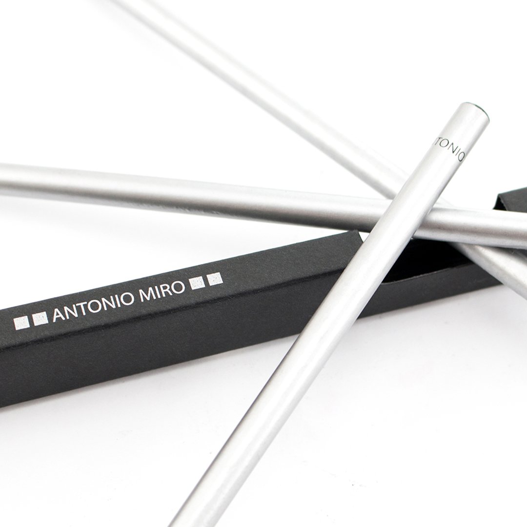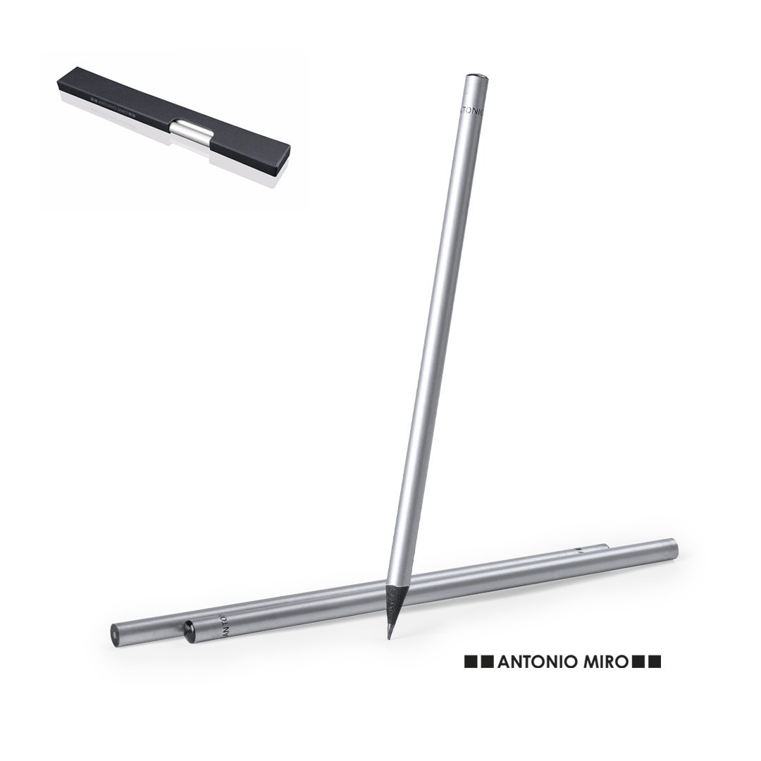 Set de 3 lápices de madera de Antonio Miró en elegante acabado plateado, con logotipo de la marca en parte superior. Presentados en elegante estuche de cartón negro con ventana y logotipo de la marca.